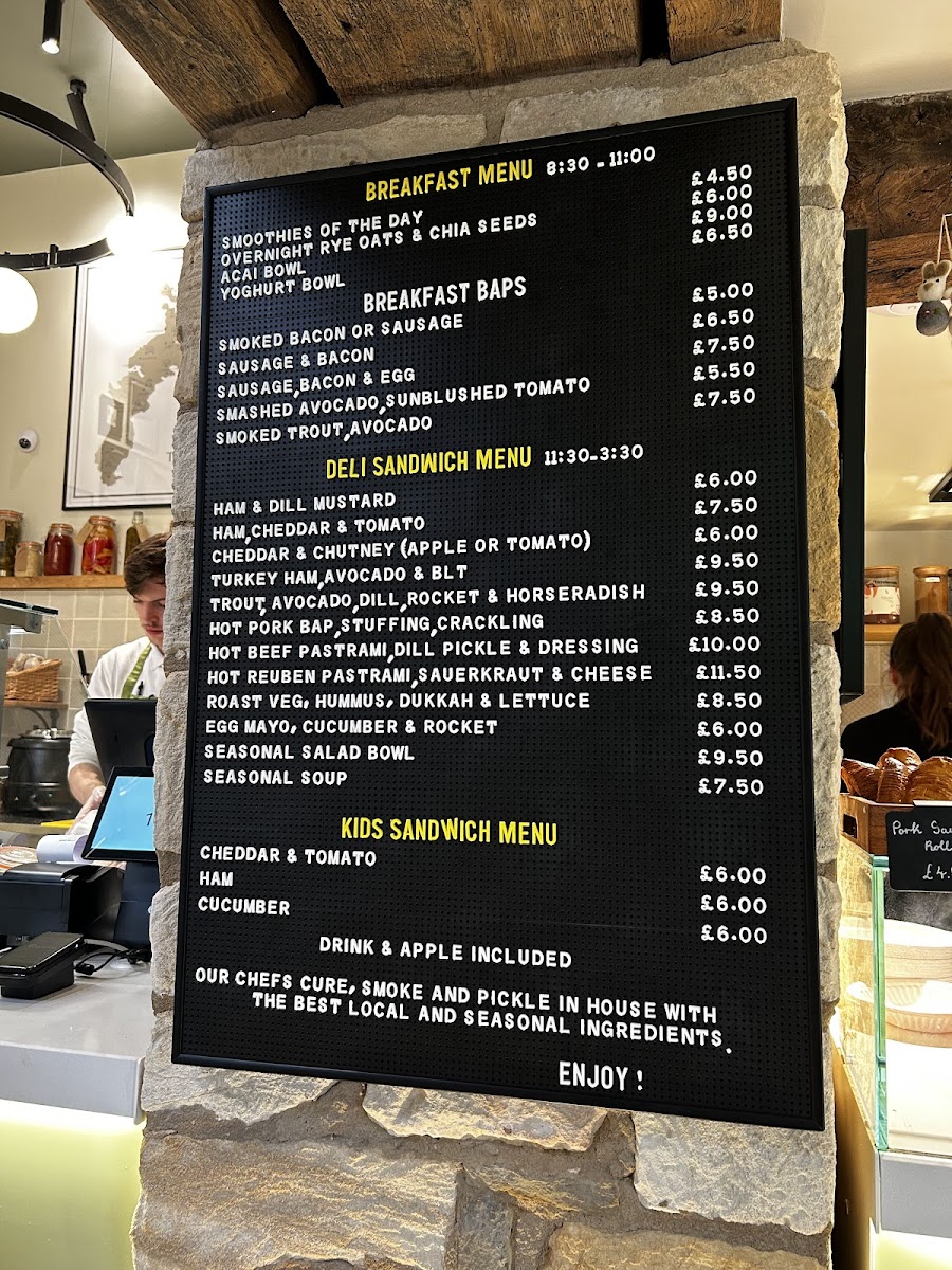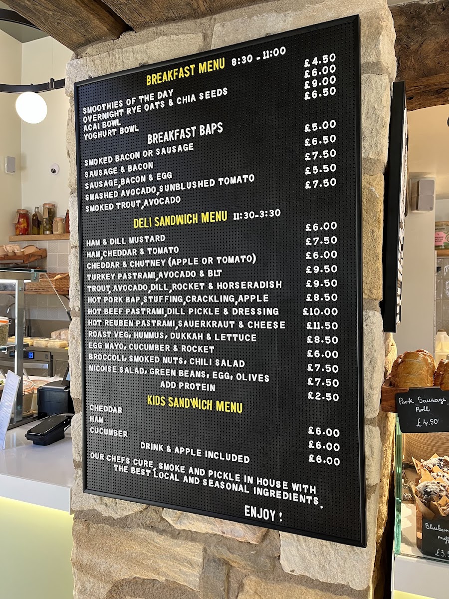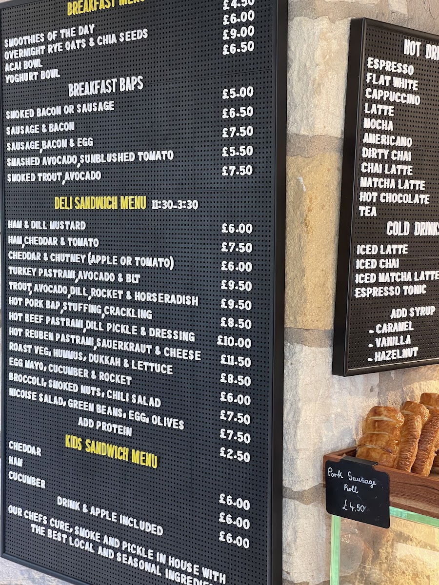 Deli Sandwiches encompass a broad array of combinations with ingredients like ham, cheddar, turkey pastrami, hot pork, hot beef pastrami, roast vegetables with hummus, and egg mayo. This section includes both cold and hot sandwiches suitable for lunchtime or light meals.